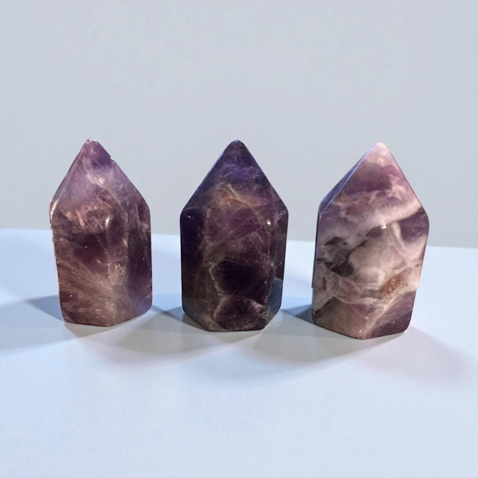 These dreamy Amethyst towers glow with deep violet, lilac, and smoky-plum tones, each one showing its own natural banding and cloud-like patterns. Their gentle shimmer and polished points make them perfect for altar spaces, meditation corners, or bedside calming energy.