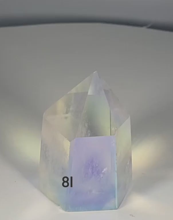 Aura Quartz is said to have a high vibration that can raise one's consciousness, encouraging peace, tranquility, and inner clarity. Clear Quartz bonded with Platinum; creates a pearly sheen with pale rainbow iridescence. Opal Aura has a very intense, strong energy that cleanses the aura, and stimulates, balances and clears all chakras, integrating the light body into the physical dimension. It allows access to one’s personal etheric realm where information concerning balance for this life cycle is presented. It is a crystal of joy, and like a rainbow, signifies hope and optimism. It facilitates a deep state of meditative awareness, grounding the information received into the physical body, and inspires a total union with the divine and cosmic consciousness. Opal Aura is also a stone of romance and love, and can bring both into one’s life. It is highly beneficial in healing hurt and trauma, for multi-dimensional healing, and is an efficient receptor for programming. It may be used for cleansing and enhancing the organs, boosting the immune system, and for bringing the body into balance. It is also thought to soothe burns.