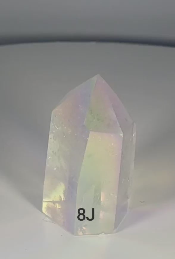 Aura Quartz is said to have a high vibration that can raise one's consciousness, encouraging peace, tranquility, and inner clarity. Clear Quartz bonded with Platinum; creates a pearly sheen with pale rainbow iridescence. Opal Aura has a very intense, strong energy that cleanses the aura, and stimulates, balances and clears all chakras, integrating the light body into the physical dimension. It allows access to one’s personal etheric realm where information concerning balance for this life cycle is presented. It is a crystal of joy, and like a rainbow, signifies hope and optimism. It facilitates a deep state of meditative awareness, grounding the information received into the physical body, and inspires a total union with the divine and cosmic consciousness. Opal Aura is also a stone of romance and love, and can bring both into one’s life. It is highly beneficial in healing hurt and trauma, for multi-dimensional healing, and is an efficient receptor for programming. It may be used for cleansing and enhancing the organs, boosting the immune system, and for bringing the body into balance. It is also thought to soothe burns.