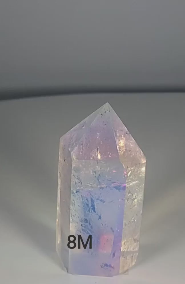 Aura Quartz is said to have a high vibration that can raise one's consciousness, encouraging peace, tranquility, and inner clarity. Clear Quartz bonded with Platinum; creates a pearly sheen with pale rainbow iridescence. Opal Aura has a very intense, strong energy that cleanses the aura, and stimulates, balances and clears all chakras, integrating the light body into the physical dimension. It allows access to one’s personal etheric realm where information concerning balance for this life cycle is presented. It is a crystal of joy, and like a rainbow, signifies hope and optimism. It facilitates a deep state of meditative awareness, grounding the information received into the physical body, and inspires a total union with the divine and cosmic consciousness. Opal Aura is also a stone of romance and love, and can bring both into one’s life. It is highly beneficial in healing hurt and trauma, for multi-dimensional healing, and is an efficient receptor for programming. It may be used for cleansing and enhancing the organs, boosting the immune system, and for bringing the body into balance. It is also thought to soothe burns.