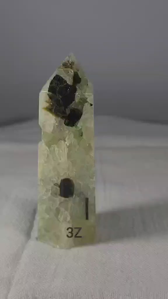 Epidote inclusions within prehnite are believed to enhance the overall healing properties of the stone, combining the calming and soothing energy of prehnite with the added strength and vitality of epidote, making it particularly beneficial for emotional healing, promoting resilience, and supporting the body's natural healing processes, especially in areas related to the heart and digestive system. Prehnite Epidote helps us to stop taking things so personally and to keep a sense of proportion during stressful times. It encourages us to be forgiving and to let go of grudges. It also invites us to question our emotional beliefs and habits and be willing to make changes as needed. Prehnite is commonly found intergrown with Epidote. Both of these stones offer up a high vibrational energy that channels directly to one's heart space. These minerals will help jumpstart one's heart and fill it with endless rays of love and compassion. Be aware that Epidote is a natural enhancer, good or bad. This tower is 3.5 inches tall.