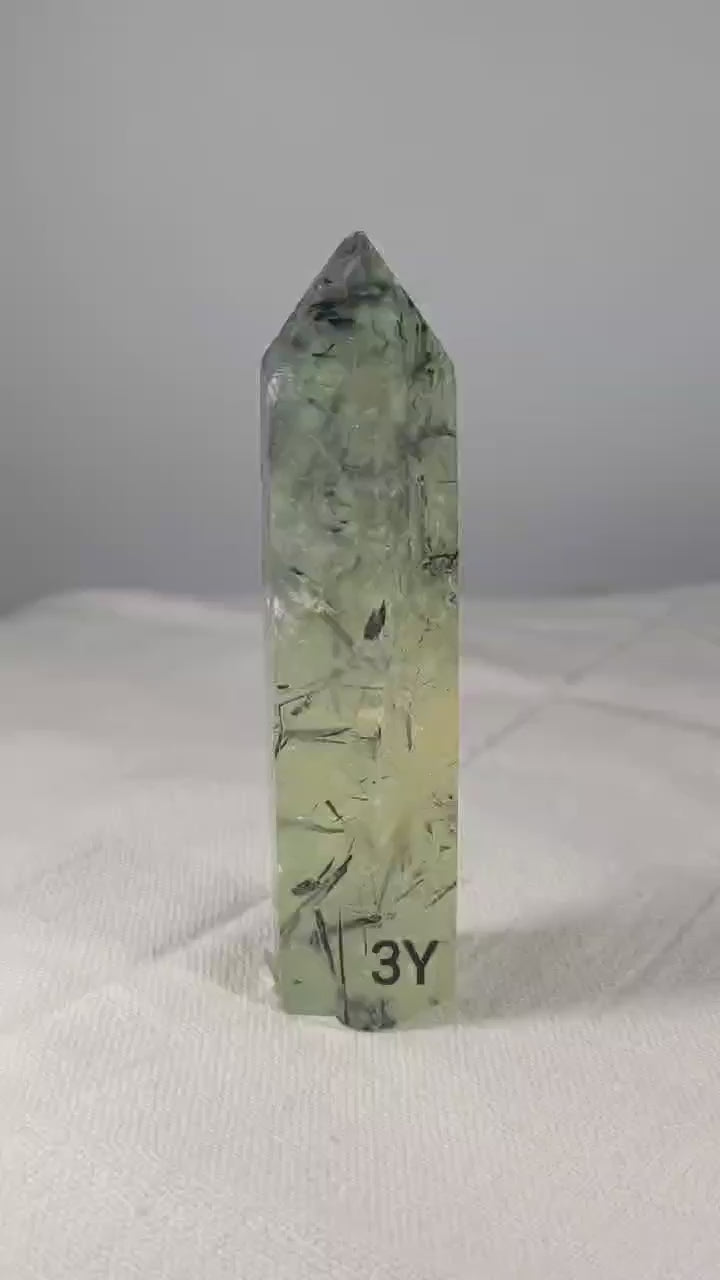 Epidote inclusions within prehnite are believed to enhance the overall healing properties of the stone, combining the calming and soothing energy of prehnite with the added strength and vitality of epidote, making it particularly beneficial for emotional healing, promoting resilience, and supporting the body's natural healing processes, especially in areas related to the heart and digestive system. Prehnite Epidote helps us to stop taking things so personally and to keep a sense of proportion during stressful times. It encourages us to be forgiving and to let go of grudges. It also invites us to question our emotional beliefs and habits and be willing to make changes as needed. Prehnite is commonly found intergrown with Epidote. Both of these stones offer up a high vibrational energy that channels directly to one's heart space. These minerals will help jumpstart one's heart and fill it with endless rays of love and compassion. Be aware that Epidote is a natural enhancer, good or bad. This tower is 3.5 inches tall.