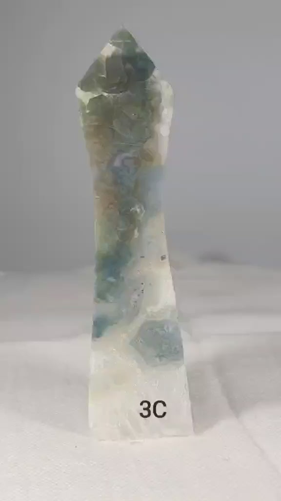 Experience the stabilizing and strengthening influence of our Moss Agate Tower. This stone has a lower intensity and slower frequency, perfect for balancing your emotional, physical, and intellectual energy. With its harmonizing effects on yin and yang, it opens the doors to new beginnings, enhances creativity, intuition, abundance, prosperity, and protection while grounding you to the present moment. Perfect for connecting with the heart chakra. This tower is 3.5 inches tall.