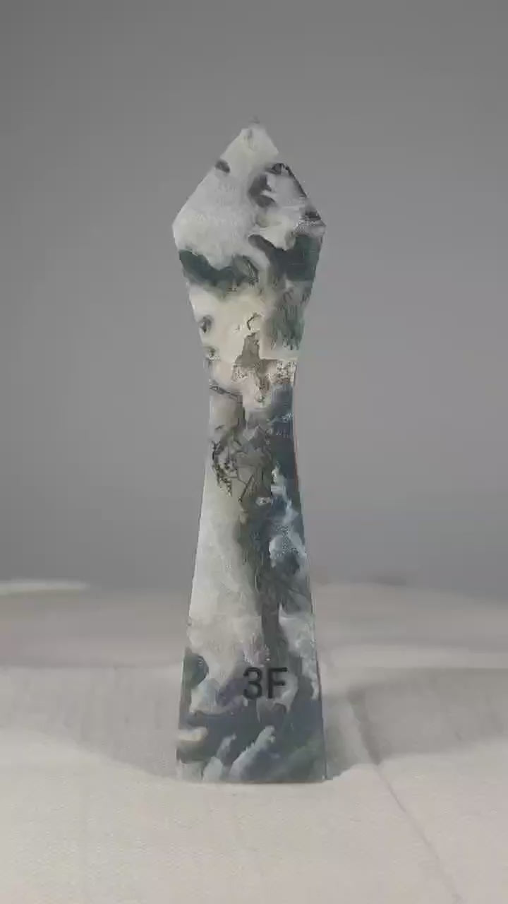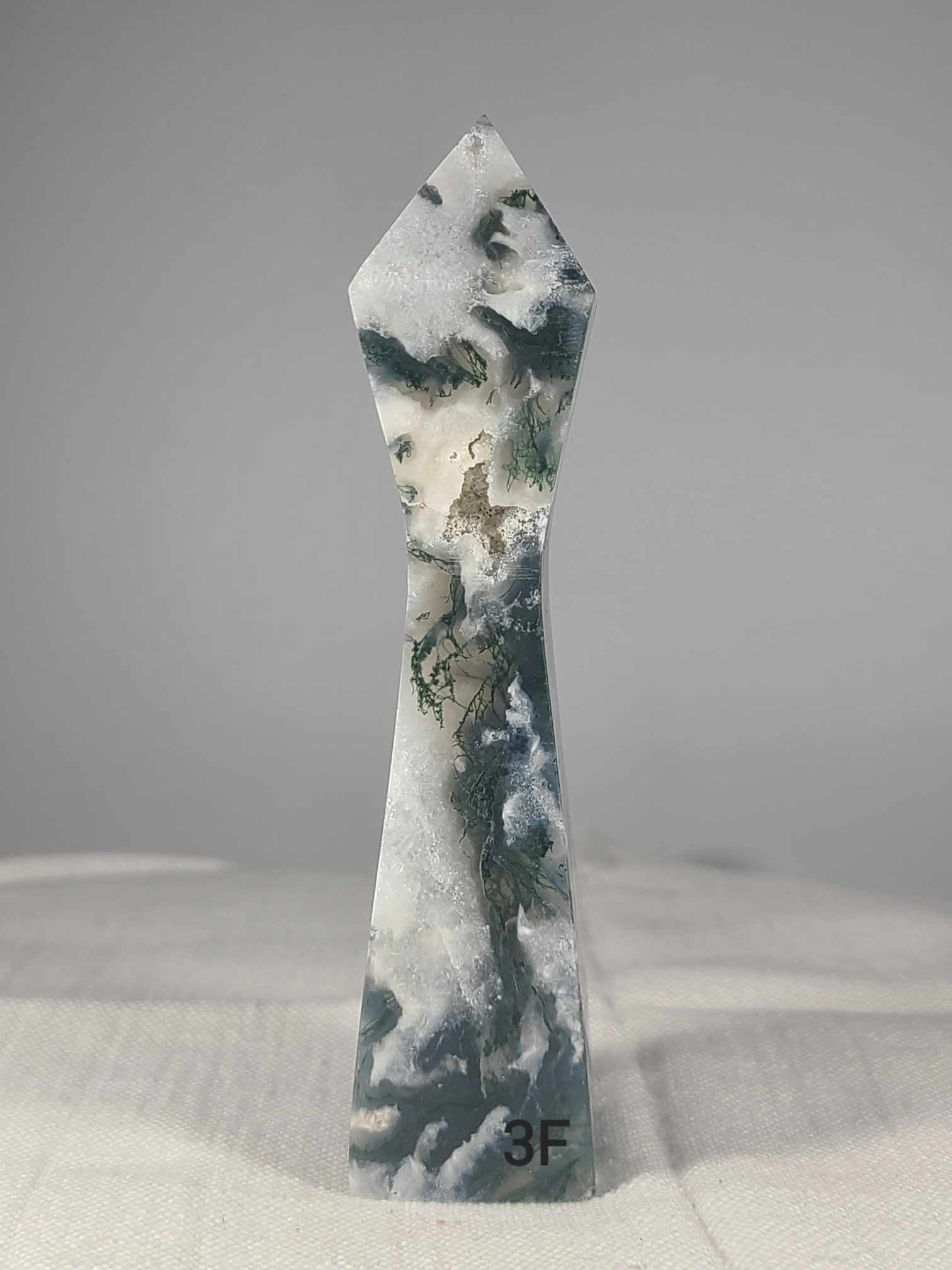 Experience the stabilizing and strengthening influence of our Moss Agate Tower. This stone has a lower intensity and slower frequency, perfect for balancing your emotional, physical, and intellectual energy. With its harmonizing effects on yin and yang, it opens the doors to new beginnings, enhances creativity, intuition, abundance, prosperity, and protection while grounding you to the present moment. Perfect for connecting with the heart chakra. This tower is 4.25 inches tall.